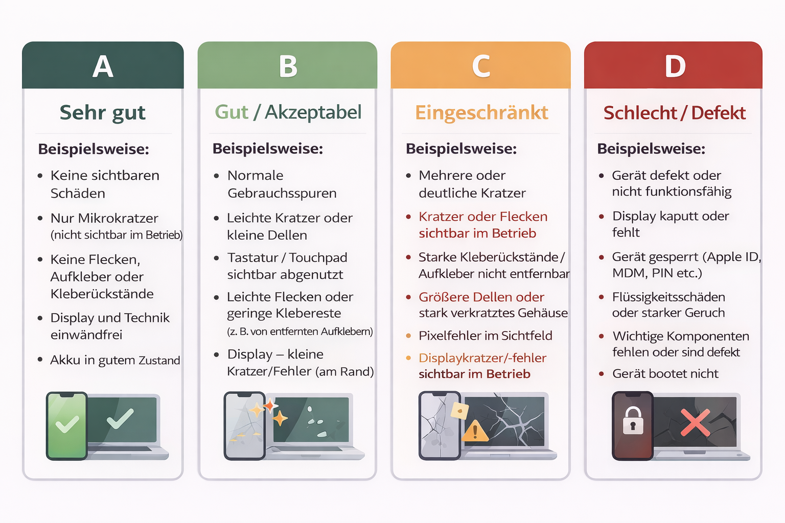 Hinweis zur Bewertung: Mehrere kleinere Schäden (z.B. Kratzer/Dellen) können zusammengenommen zu Grade C führen. Die Bewertung solcher Schäden hängt auch von Anzahl und Position ab (z.B. Kratzer am Display-Rand vs. Kratzer im zentralen Bereich="im Betrieb sichtbar").